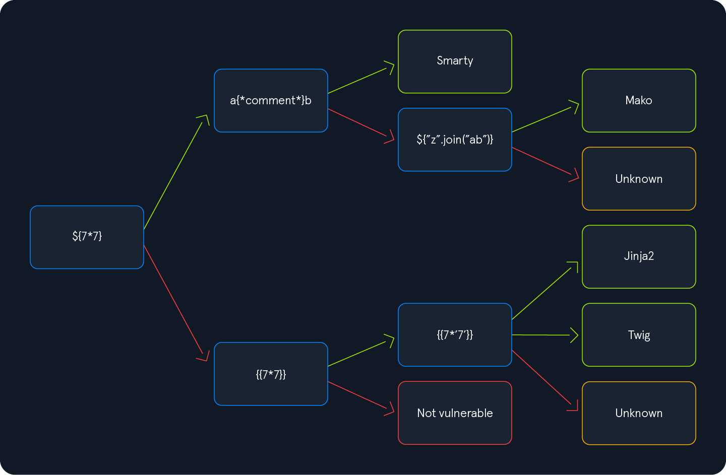 The testing payloads and exploitation routes depend on the templating engine used in the backend.
